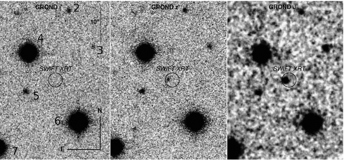 GROND i'- (left), z'- (middle), and J- (right) images of the afterglow from
